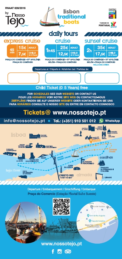 A única empresa que realiza passeios em embarcações tradicionais do Tejo de grande porte em Lisboa (devidamente registados na Marinha do Tejo - Pólo Vivo do Museu de Marinha Portuguesa, e portanto, considerados peças de museu), tornando os nossos passeios uma experiência verdadeiramente única. Realizamos passeios regulares todos os dias do ano com guias profissionais e também alugamos as embarcações em exclusivo. Este ano temos novidades para complementar a nossa oferta. Venha conversar connosco!