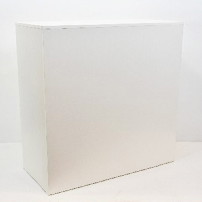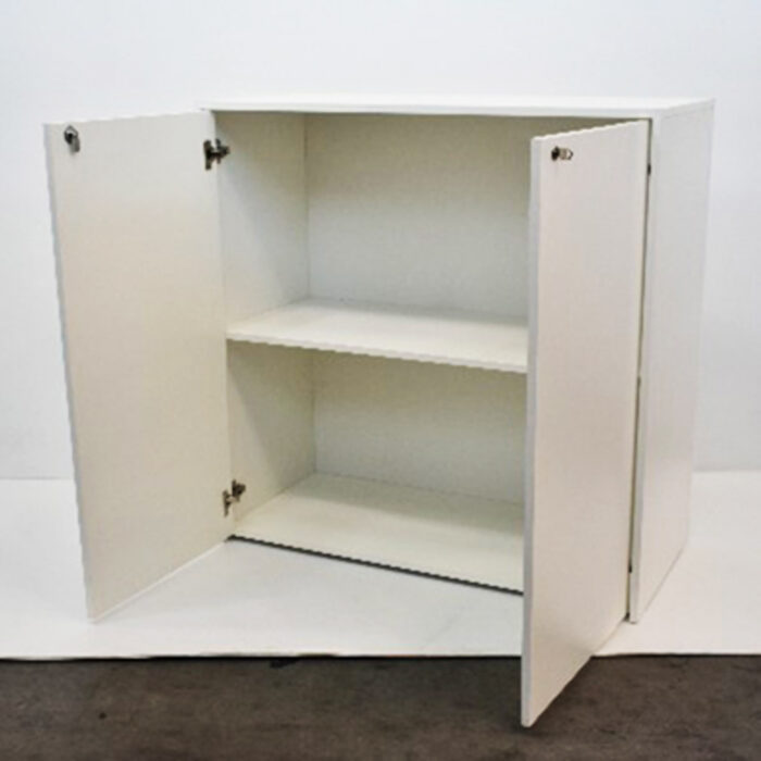 Balcão branco em aglomerado de madeira, com prateleira no interior, portas e fechadura.