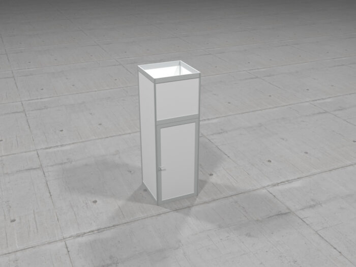 Área reservada com porta e fechadura, com 3m de altura, construída em estrutura de alumínio e painéis de aglomerado branco.