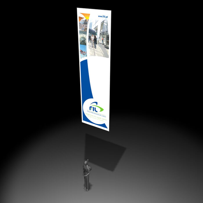 O pendão ficará localizado dentro da área do stand. A suspensão é efectuada com 2 cabos de aço e de forma manual, não sendo possível garantir a localização exacta.