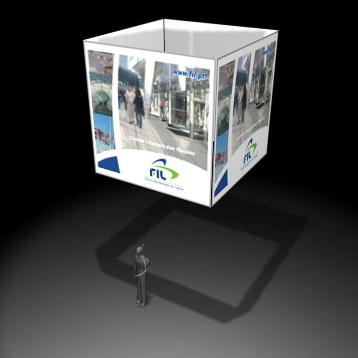Produção e suspensão de pendão cúbico composto por 4 telas individuais, com as medidas seleccionadas