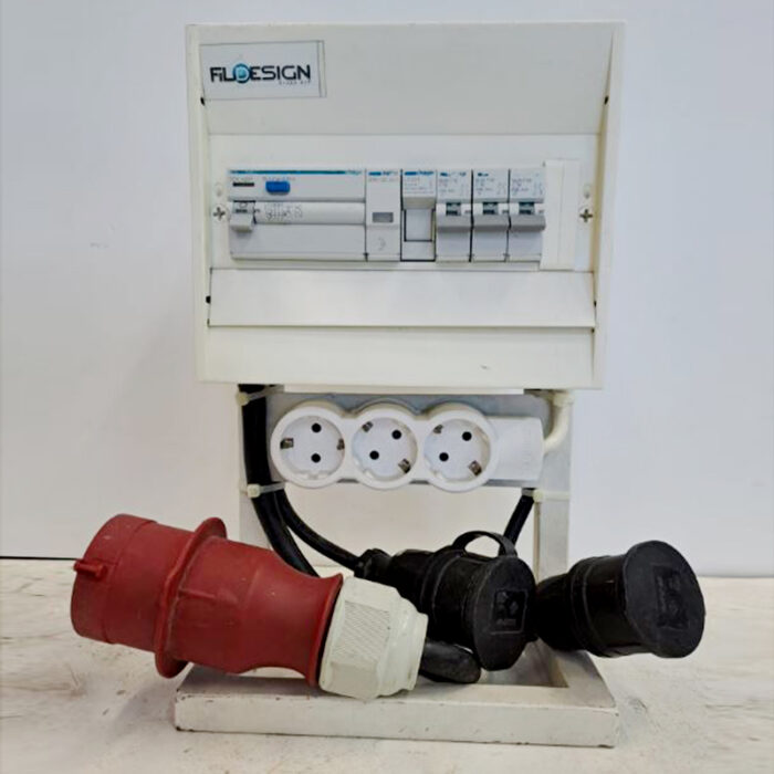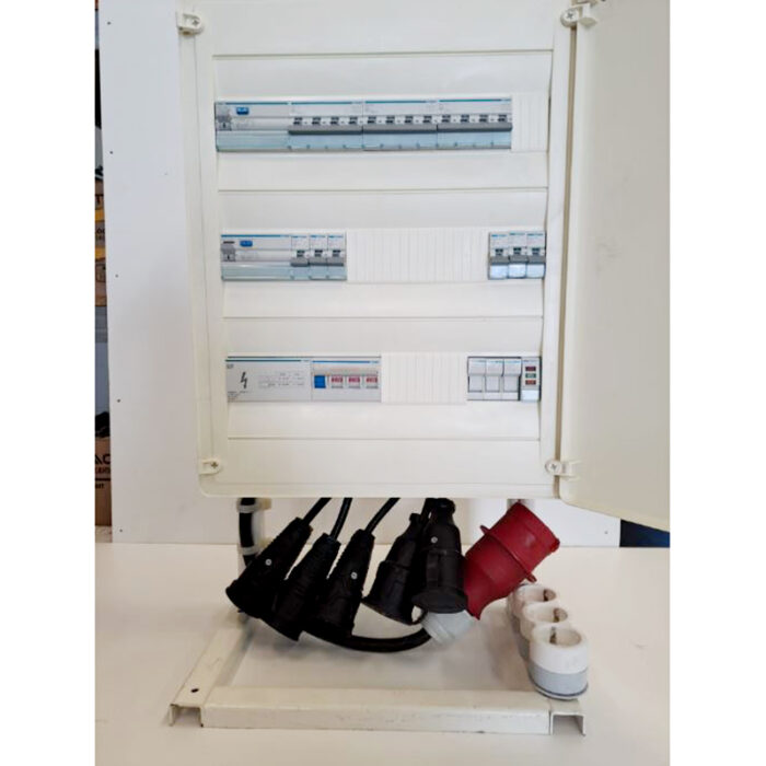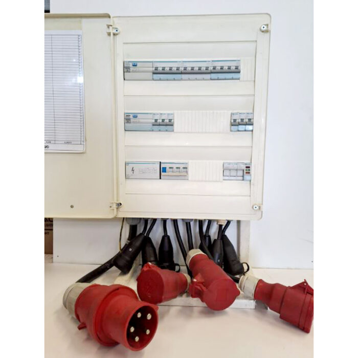Com 1 tomada trifásica tipo CEE 32A, 2 tomadas trifásicas tipo CEE 16A e 6 tomadas monofásicas tipo schuko 16A